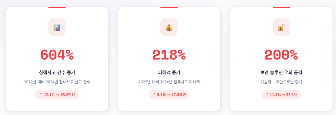 침해사고 건수와 피해 규모가 매년 급증하고 있으며, 기술적 보안만으로는 충분하지 않습니다.